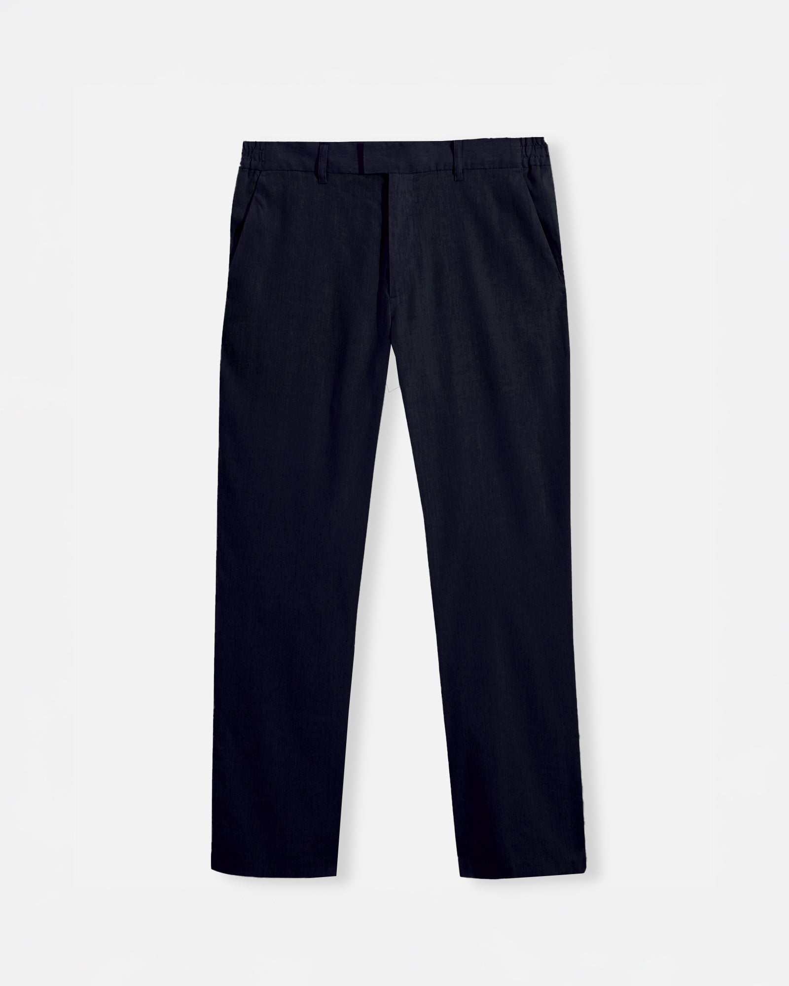Japanese technical linen trousers with anti-wrinkle technology. The garment features two side pockets, two back pockets with snap buttons, a zip fly, and a hidden hook closure at the waist.