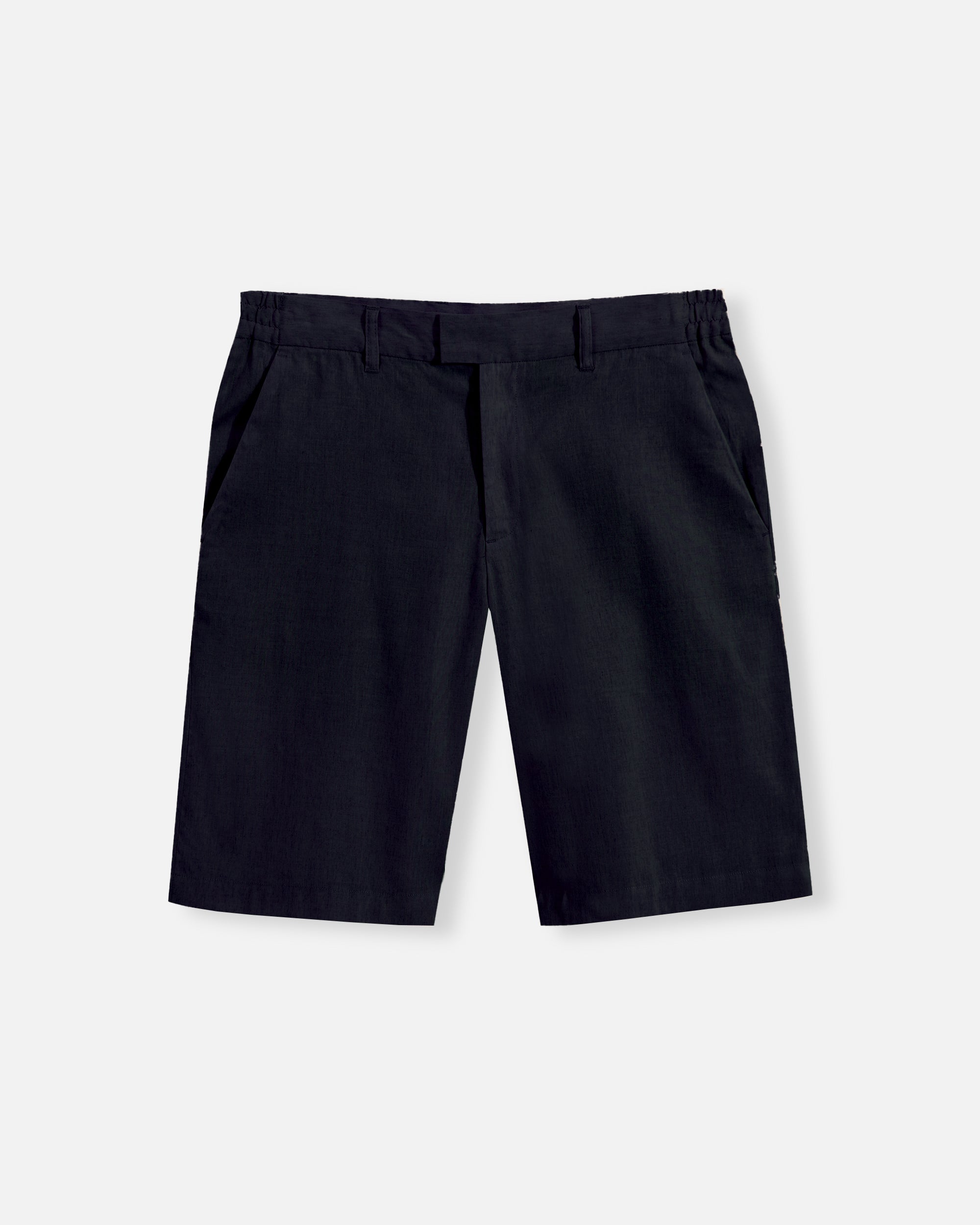 Japanese technical linen shorts with anti-wrinkle technology. The garment features two side pockets, two back pockets with snap-button closures, a zip fly, and a hidden hook fastening at the waistband.