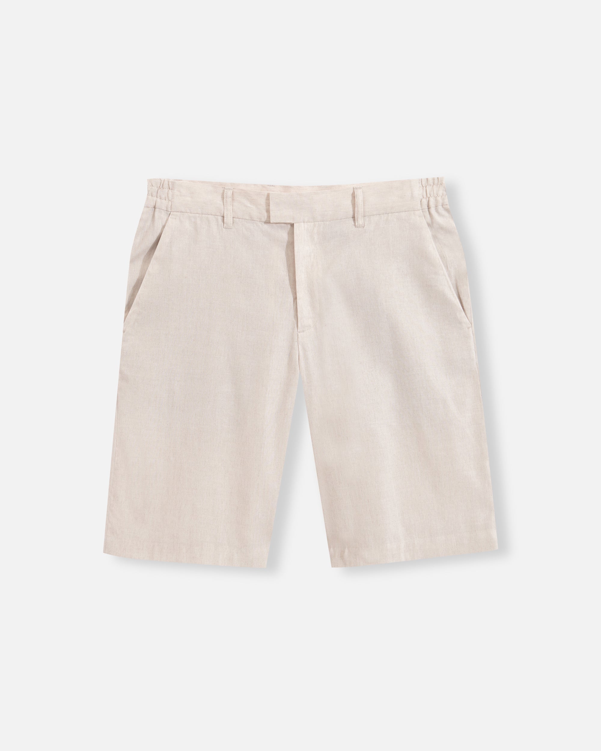 Japanese technical linen shorts with anti-wrinkle technology. The garment features two side pockets, two back pockets with snap-button closures, a zip fly, and a hidden hook fastening at the waistband.