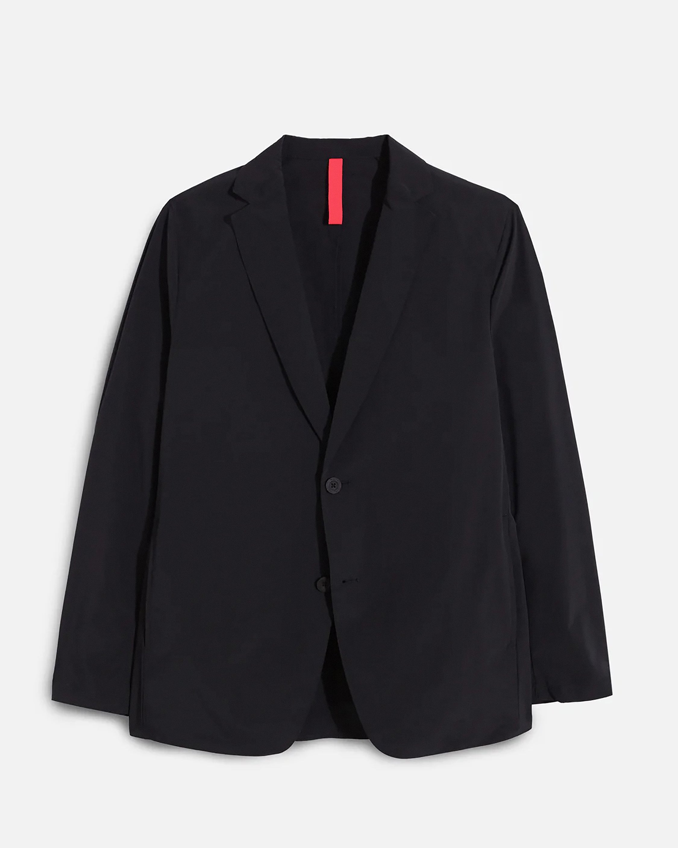 Americana de tejido técnico doble en color navy, con bolsillos laterales y dos bolsillos internos. Tejido bi-elástico, impermeable y libre de PFC.