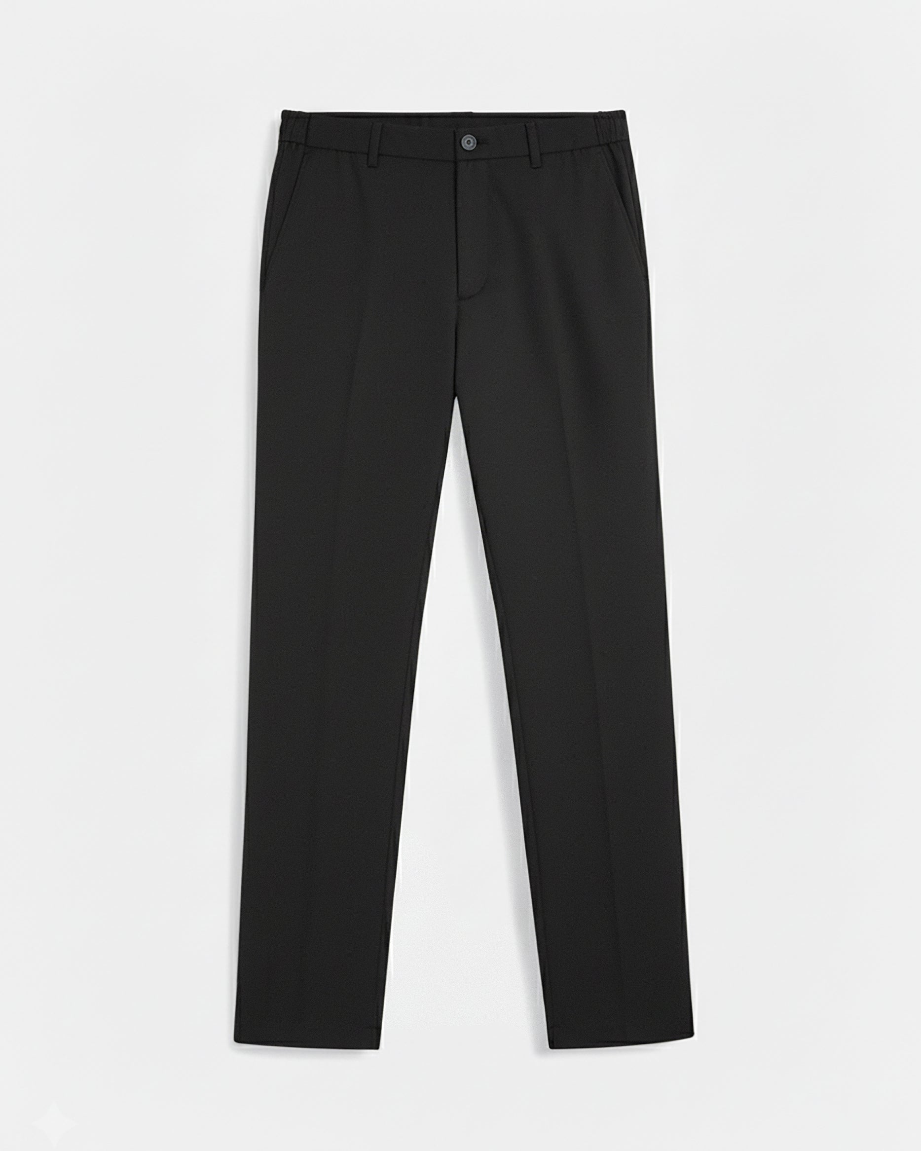 Pantalón de traje navy confeccionado en tejido técnico doble, diseñado con bolsillos laterales delanteros, cierre frontal con cremallera y botón, y dos bolsillos traseros con cierre de broche a presión. Cinturilla deportiva con cordón interno para un ajuste cómodo. Tejido bi-elástico, impermeable y libre de PFC.