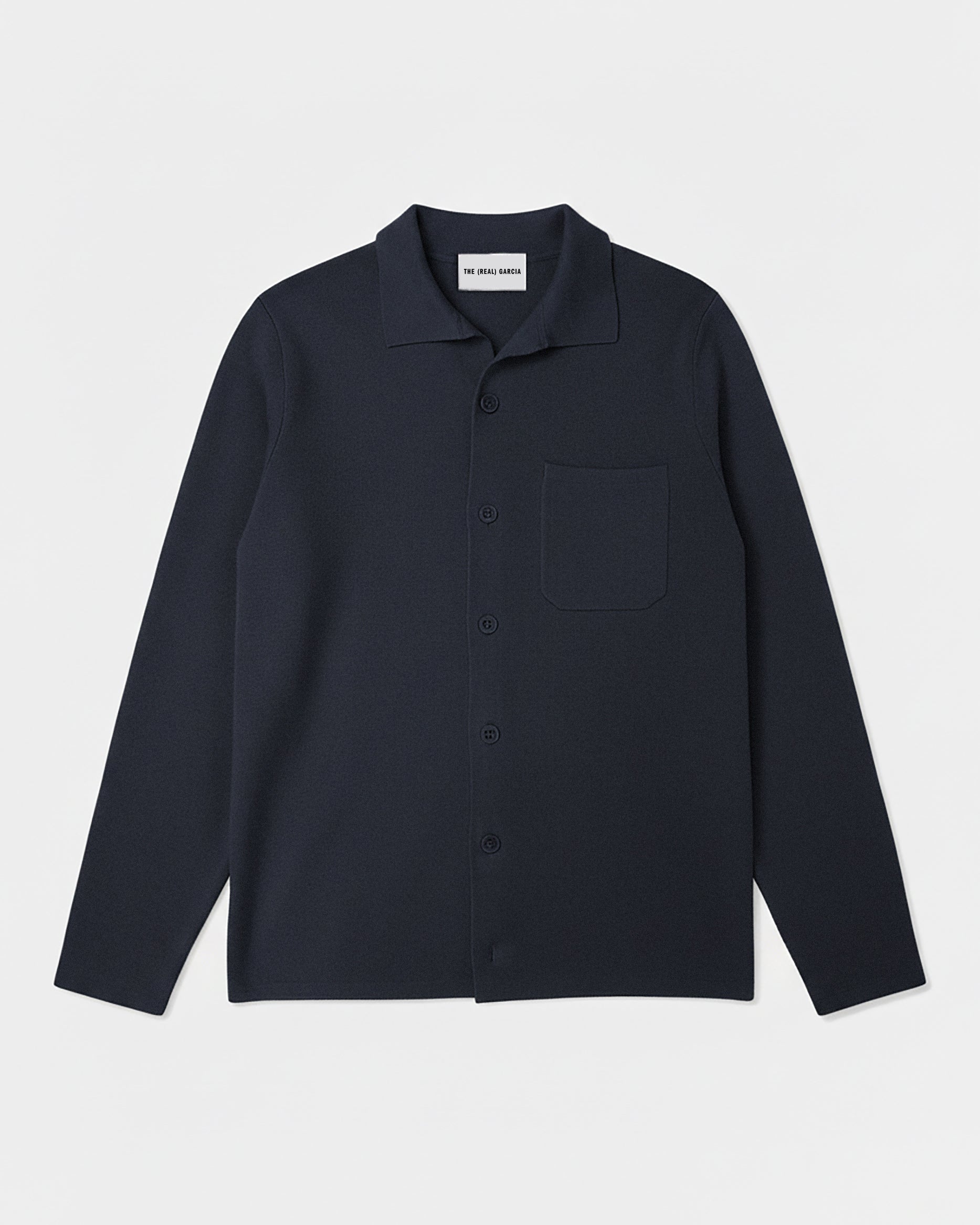 Sobrecamisa khaki de lana merino. Cárdigan de hombre con bolsillo en el pecho, bajo sin ribete y hilera central de botones.