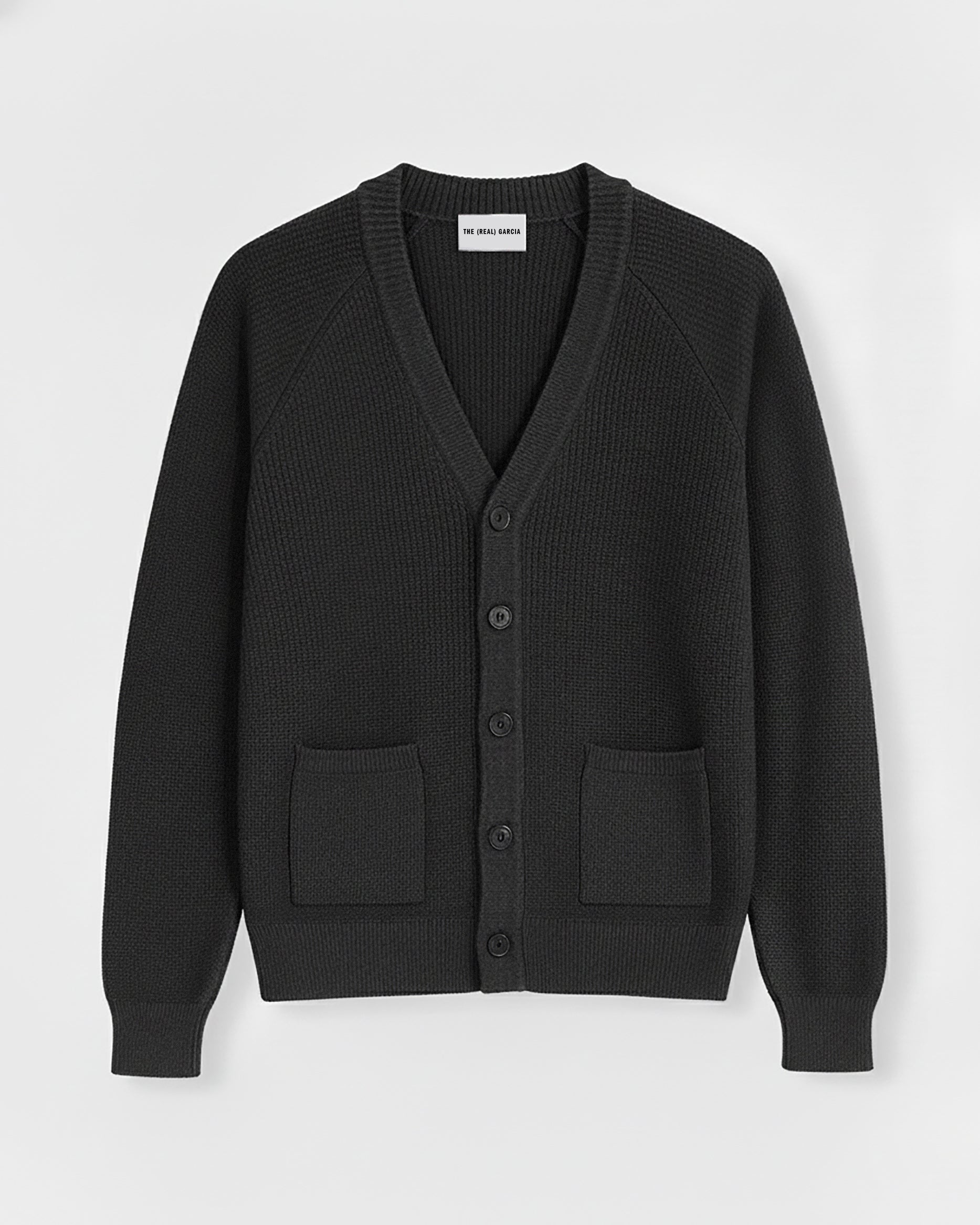 Cárdigan negro con bolsillos confeccionado en 90% lana y 10% cashmere. Presenta bolsillos frontales, cierre con botones y acabados de ribb en puños, escote y bajo.