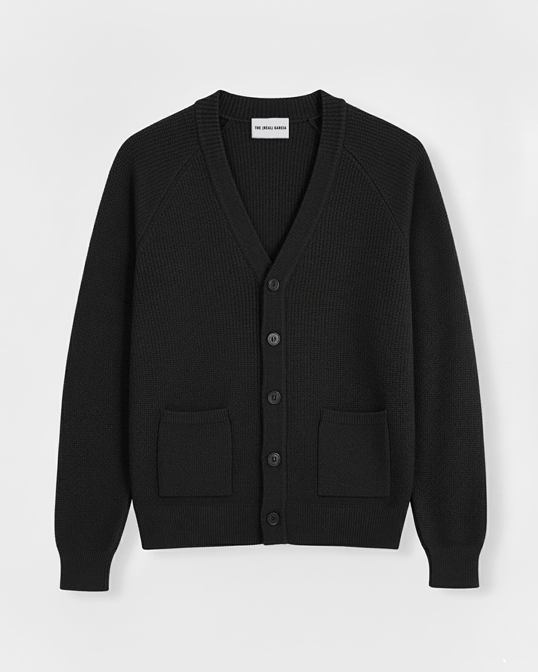 Cárdigan gris oscuro con bolsillos confeccionado en 90% lana y 10% cashmere. Presenta bolsillos frontales, cierre con botones y acabados de ribb en puños, escote y bajo.