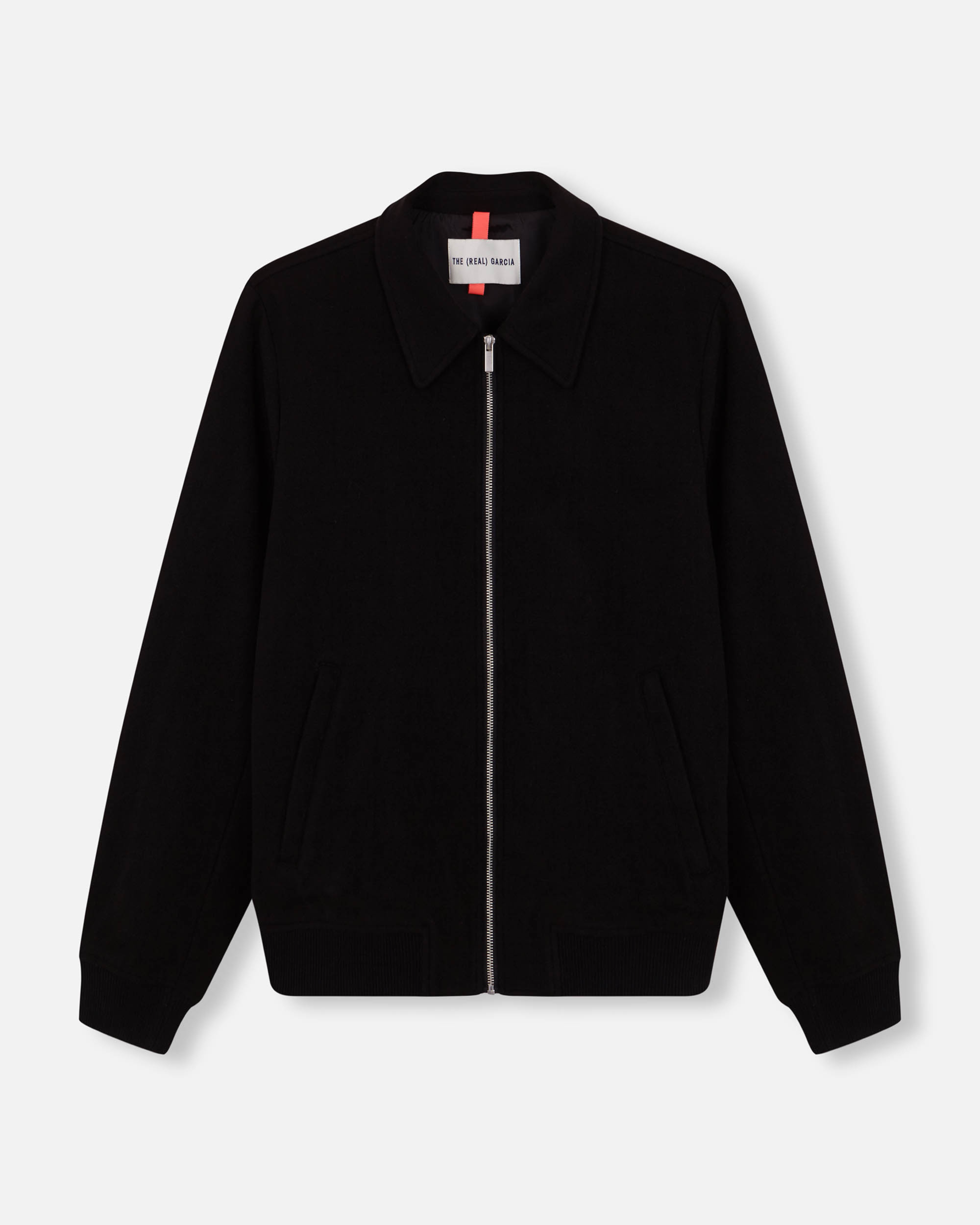A shirt collar zippered bomber made of an elastic knitted wool fabric. Wide ribbing at the hem and cuff for greater comfort and fit.