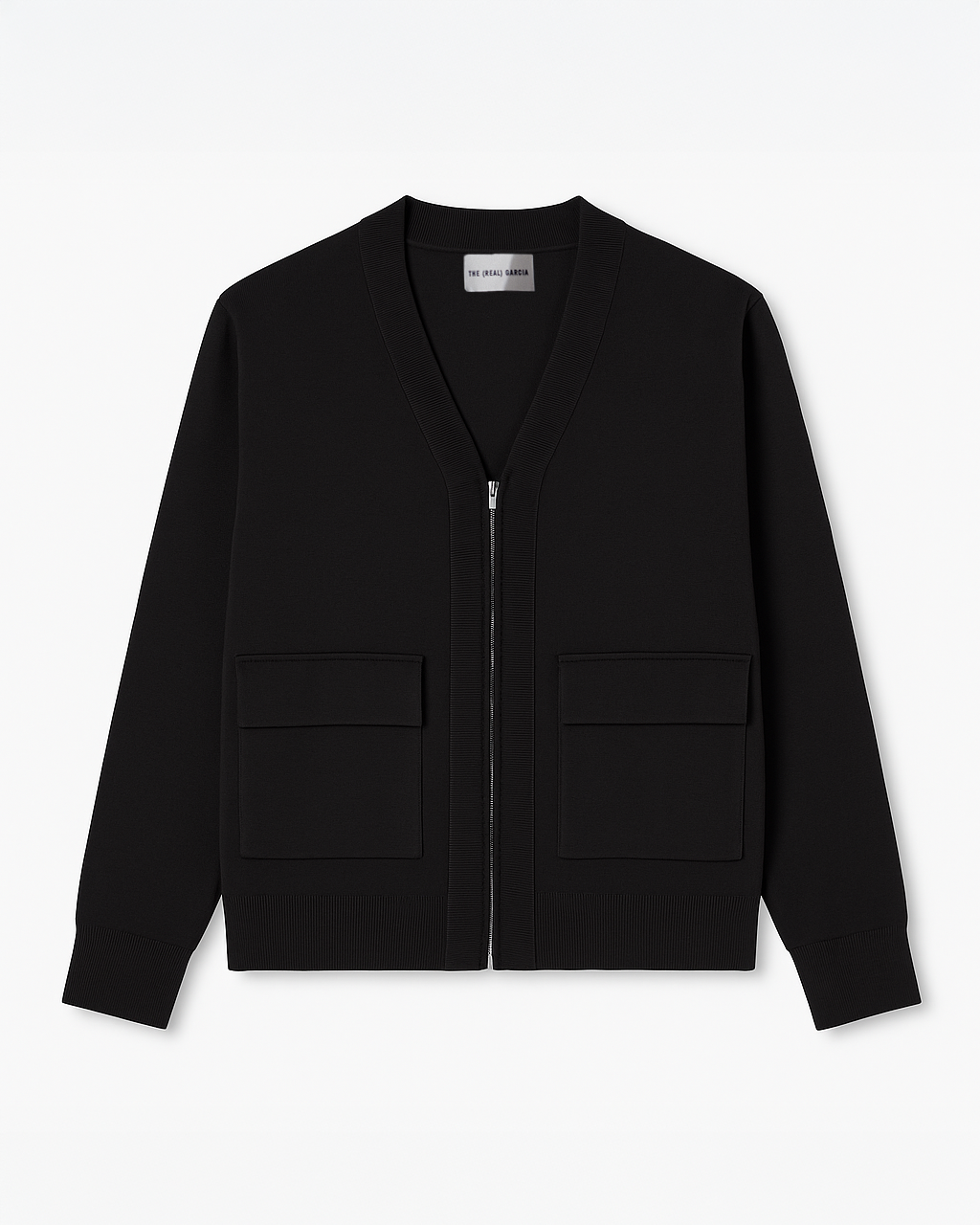Cárdigan de punto con cierre en color negro y confeccionado en 53% poliéster, 20% nailon y 19% acrílico. Presenta cierre frontal con cremallera, dos bolsillos de parche y acabados de canalé en escote, puños y bajo.